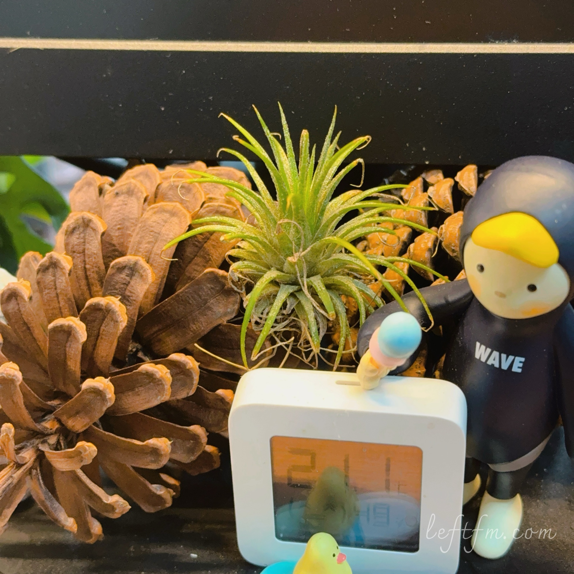 空气凤梨是对干湿循环周期要求高的,既要湿度,又要通风,最好每天都能有好几轮的干湿循环。长假期间很难做到,可以放点湿布、水杯在周边,即便没有办法做到浸湿、通风养得很好,但至少不会轻易干瘪或者烂掉。与之相反的是多肉,能不浇便不浇。人在,常看,多浇一点,还能补救。放假时,浇多了,弄不好回来就化作一滩水。