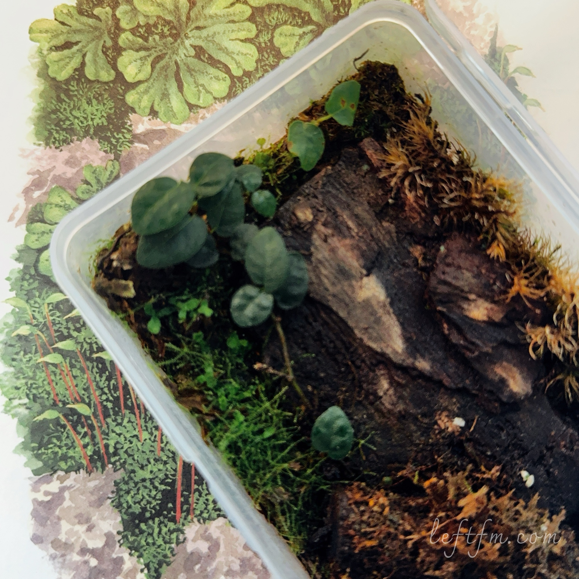 苔藓、地衣、薜荔、蕨类……这一类或是本来就没有束维管的植物,或者适应高潮弱光环境的植物,生长速度都是极为缓慢的。这一根薜荔,来的时候大概就十来片叶子,适应环境的过程之中又落掉了四五片。入手快三年了,也就只长了不到1公分的要子,叶子数数也就十来片。这个盒子里面,还有中华水龙骨之类的蕨类,我常常不知道它是什么时候生的,也不知道它是什么时候死的,常常令我意外地长出一根来,然后又在悄无生息的状态中枯萎掉,令我琢磨不出来养护的经验来。盖上盒盖闷养,打开时有惊喜,时有失落,后来也就渐渐寻常了。