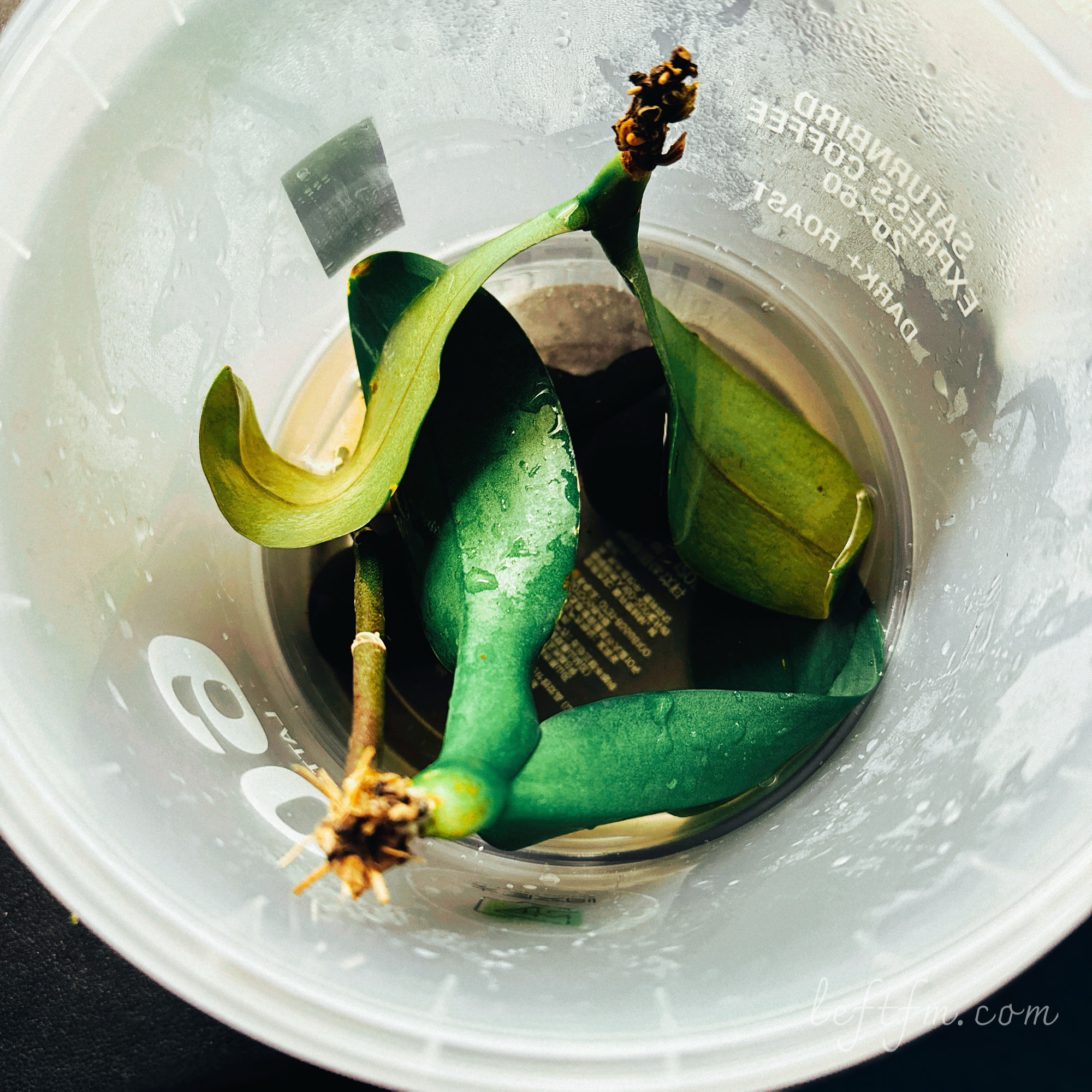 看到别人扔的,根、茎、叶问题都不太大的蝴蝶兰,就会生出恻隐之心来。毕竟是条命啊,总归还要试一试能不能救的。根烂了,剪掉就好;花败了,修掉就好;叶子腐了,剥掉就好了。“倒栽葱”的方式闷养一段时间,及时换水防止霉变腐烂,总归还是有机会救回来一两棵的。