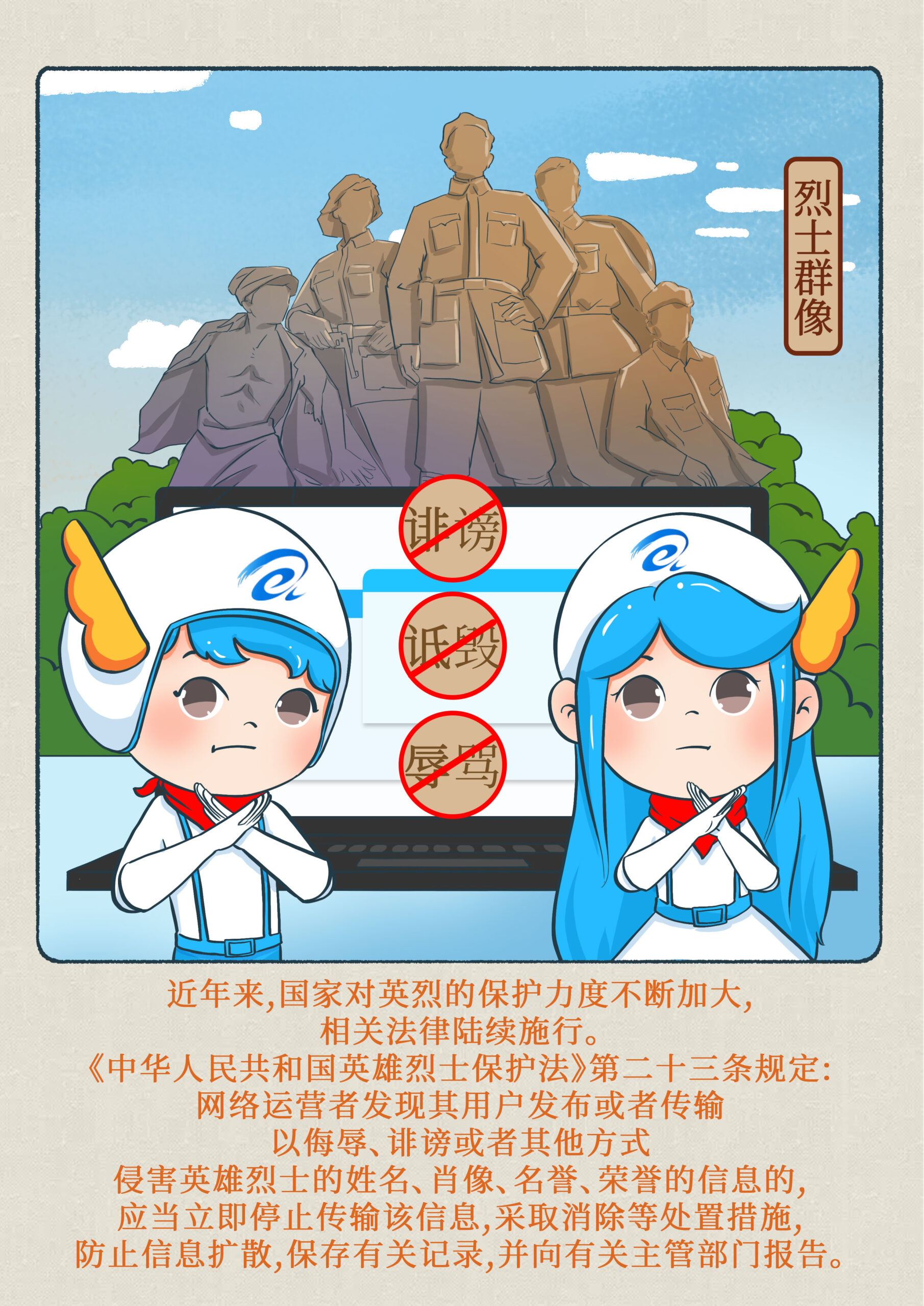 英烈事迹和牺牲精神,是中华民族的共同历史记忆和社会主义核心价值观的重要体现,也是我们砥砺奋进建设社会主义现代化网络强国的不竭动力。互联网既是传播英烈事迹的重要平台,同样也是我们保护英烈形象,守护英烈忠魂的“主战场”。近年来,国家对英烈的保护力度不断加大,《中华人民共和国英雄烈士保护法》等相关法律法规陆续施行,从加强互联网监管角度立法保护英烈形象。