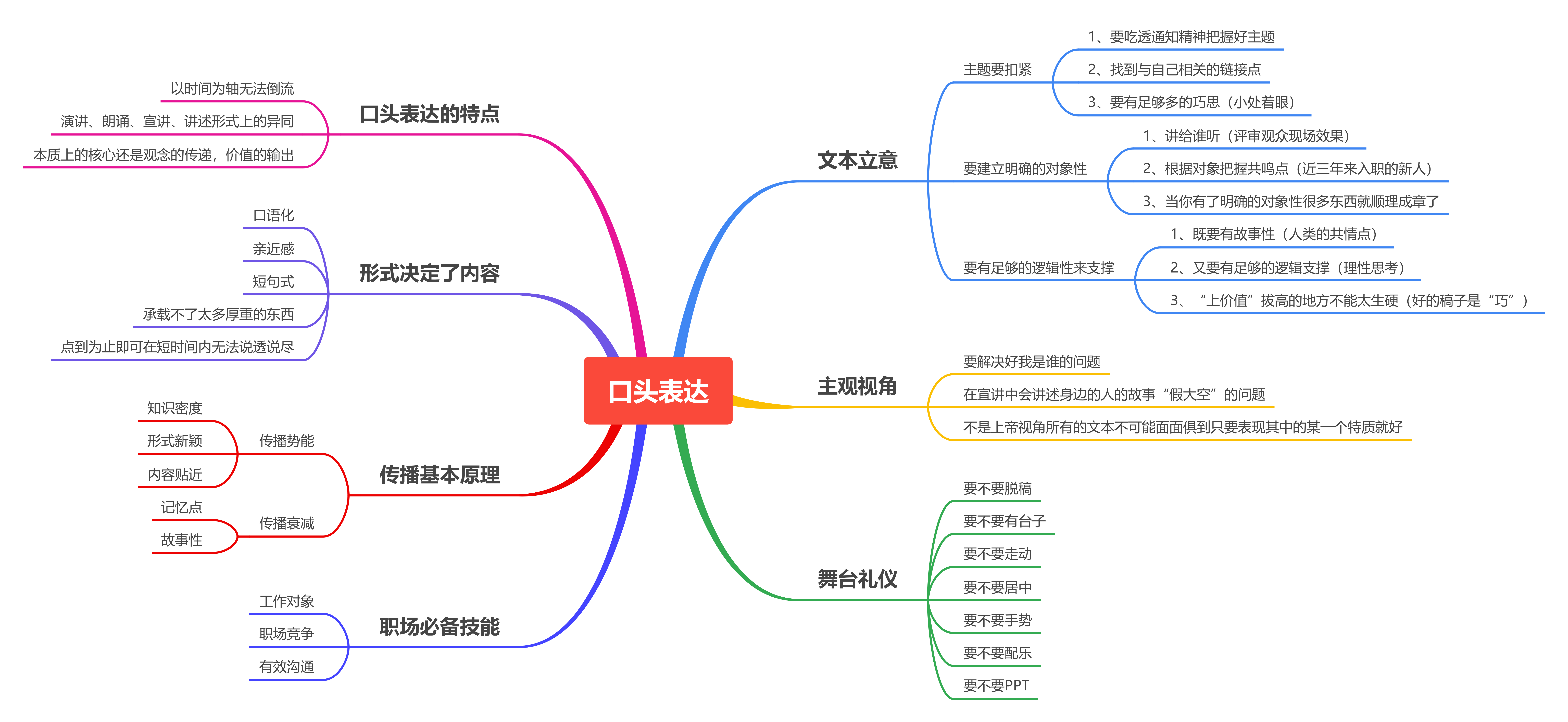 思维导图:口头表达 左叔 2024-04-26 福利 191 0 左叔:这张思维导图是为了某次演讲比赛现场点评准备的,我觉得跟准备讲话稿比起来,思维导图是一个比较有效率的办法。虽然,后来在现场根据主办方的要求,对选手的现场表现进行了逐一“点评”,但基本上也是沿着这张思维导图的方向进行表达的。这张图所列出来的内容,基本上就是我这些年从事或者参与和口头表达相关的一些活动经历的反思和总结,必定有不够全面和完善的地方,但也都是自己亲身踩坑试雷之后的结果,希望有机会能够和一些爱好者共同推敲探讨。 上一篇: 最美人间四月天 下一篇: 思维导图:《娄江夜读》栏目创作座谈会发言提纲