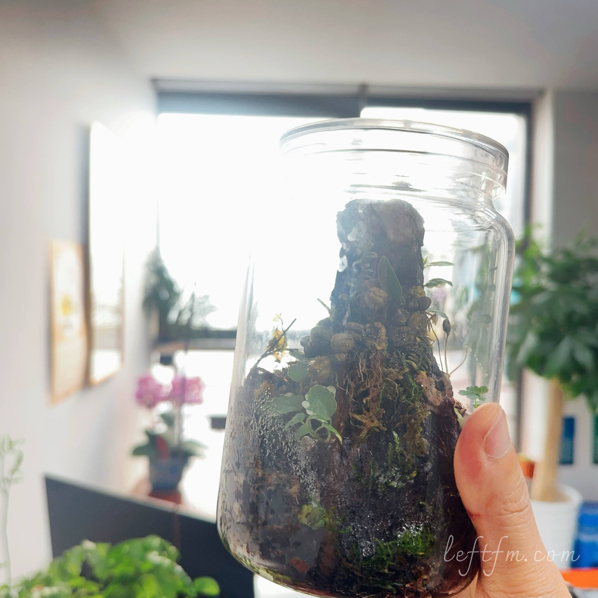 像天湖荽、花叶薜荔、网纹草以及石豆兰,这些植物是喜高湿的,可以闷养的植物,基本上也不太用管,偶尔打开透透气,给点水。生态小鱼罐里面的小斗鱼也是佛系喂养,水生的浮萍和水草也挺治愈的。花器有用空茶叶罐、炖品瓶、小饭盒,洗晒干净去掉胶痕就可以用了,树枝和松树皮都是捡的,只花时间不花钱。哪怕是一盒小小的苔藓呢~对吧~也是有感染力的~
