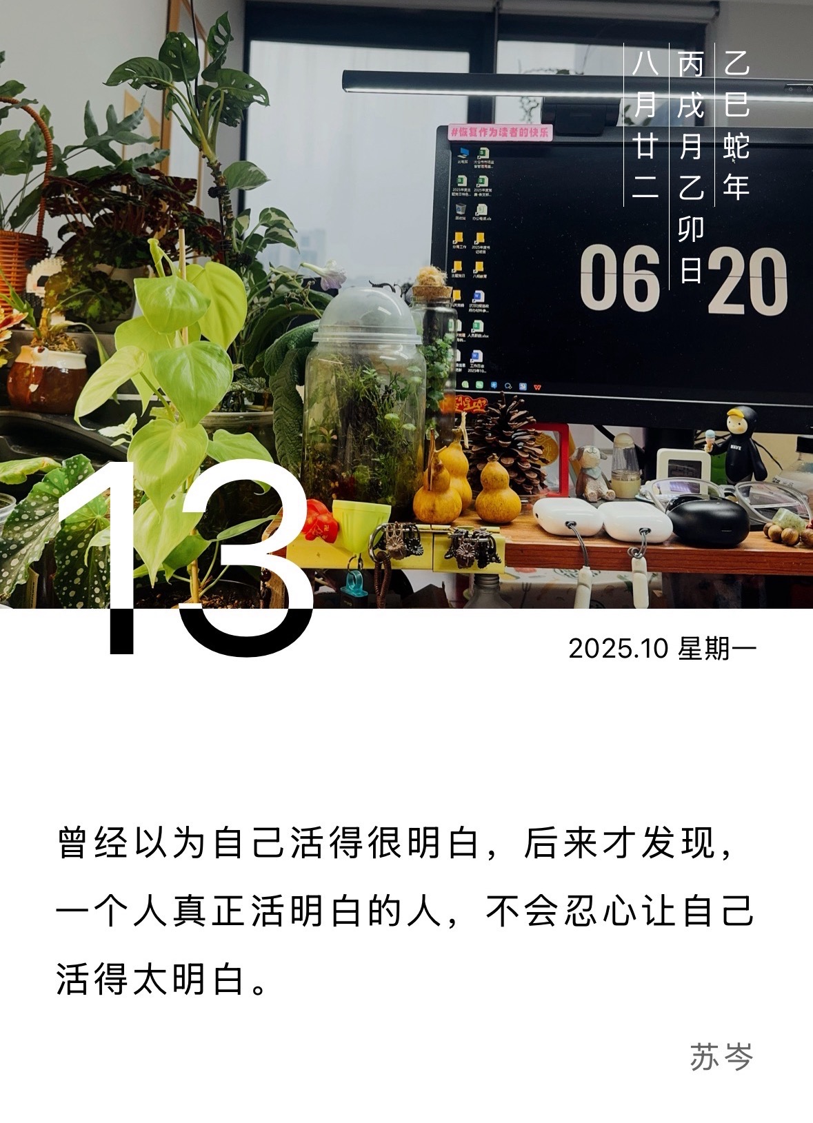 疑心是另一个时空的自己,透过梦境与自己建立了连接,在骤然醒来的那一刻,连接被切断。不得已,他又悄悄地隐身,退回到属于自己的时空里。想要跨越时空传递的信息被阻隔开,这是一次突破次元壁的溃败,想来也是非常“魔幻”的。年纪一把,却依然会有这般的“胡思乱想”会自然而然地萌生出来。